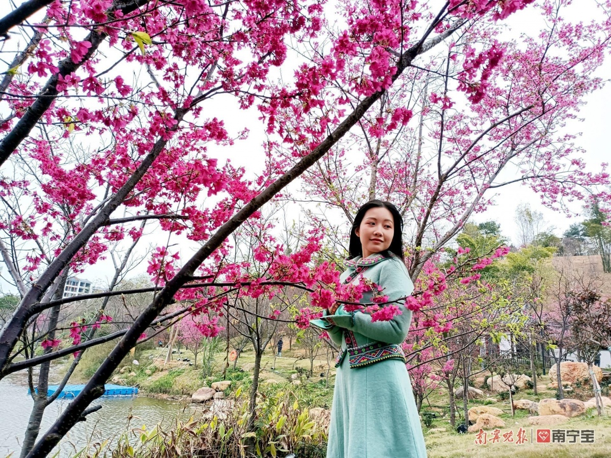 1月16日,记者来到南宁市青秀山东区樱花园看到,樱花初绽,迎风舞动。白天淡淡的粉色与蓝天白云相衬;夜晚樱花流光溢彩、梦幻迷离,在灯光映照下闪闪发亮,恰似一朵朵美丽的星花。
