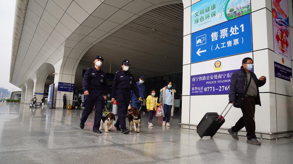 “‘咖啡’,你要跟着‘牛牛’老师好好学习!”大年三十一早,在广西南宁火车东站的进站口前,南宁铁路公安局的警犬训导员唐琥犀向他们两位“伙伴”进行上岗前的谈话。今年春运中,8岁的资深警犬“牛牛”和实习警犬“咖啡”要在实战中完成“传帮带”。