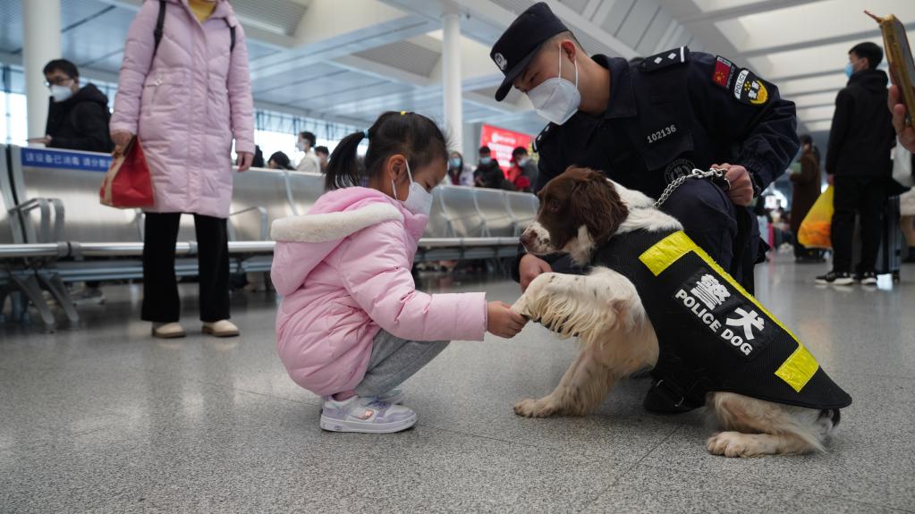 “快看!是‘汪汪队’!”7岁的小旅客黄梓潼一脸惊喜地跑到“牛牛”跟前。她说,身穿“警服”的“牛牛”让她想到了最爱看的动画片里的警犬,觉得特别亲切。唐琥犀一个眼神的示意,“牛牛”便乖巧坐下。“警察叔叔,我可以握一下它的手吗?”黄梓潼大声提问,还迫不及待地伸出了小手。唐琥犀欣然答应了,他发出“握手”的指令后,“牛牛”轻轻地伸出小爪子,放在黄梓潼的手上。黄梓潼的家人在一旁举起手机,拍下了这温馨的一幕。