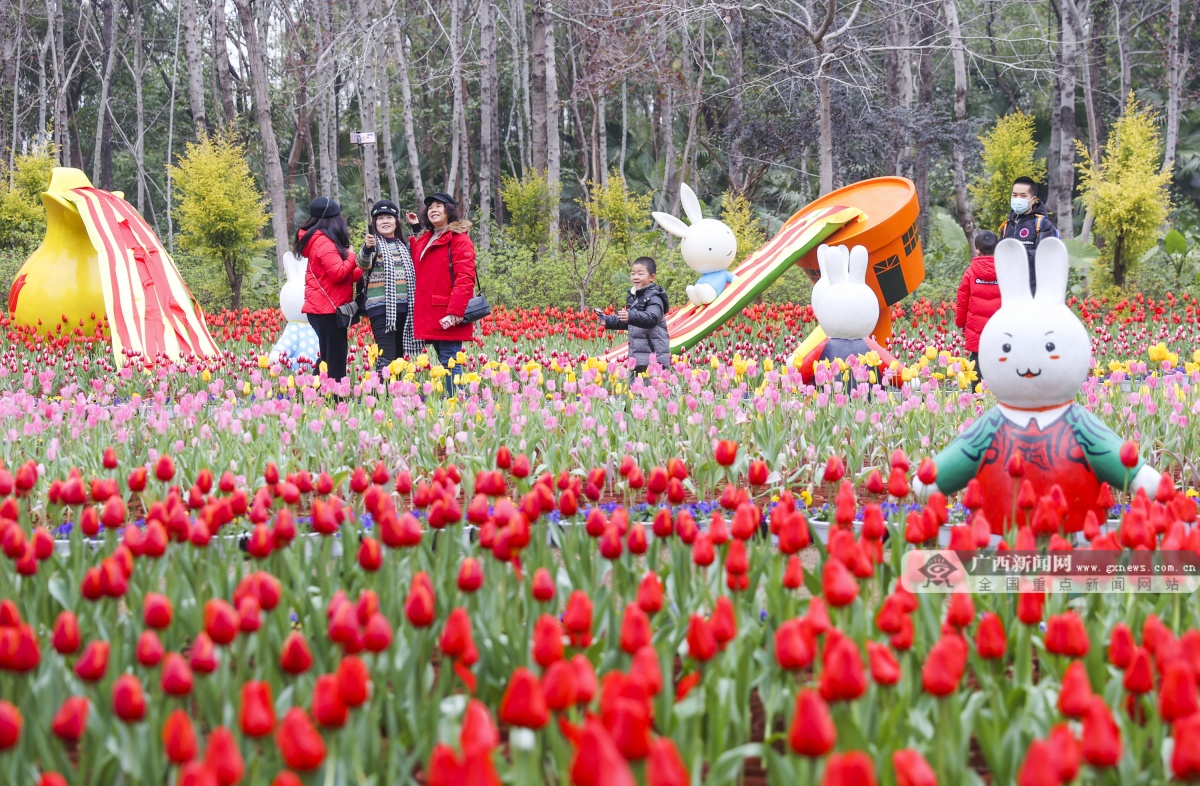 1月23日大年初二,桂林市訾洲公园的郁金香花渐次开放,吸引不少游客前来观赏。刘 峥 摄