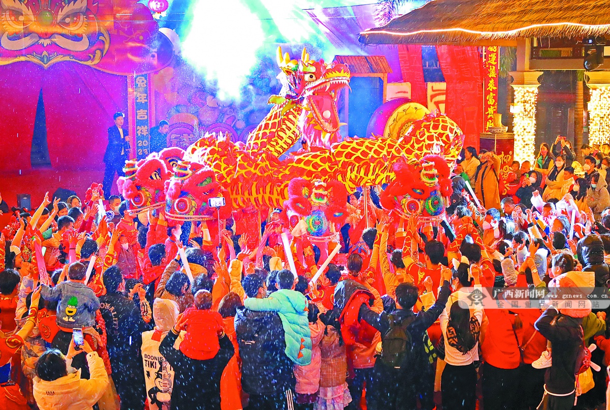 兔年春节期间,南宁市青秀山、园博园和“南宁之夜”等景区和夜市纷纷举办迎新春系列活动,丰富市民的节日文化生活。图为市民在方特东盟神画主题乐园观看舞龙表演。记者 周 军 摄