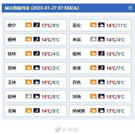 28日白天到29日晚上,全区晴到少云,桂北部分地区有霜冻或冰冻。最低气温:高寒山区零下8~0℃,桂北0~5℃,桂南6~9℃。