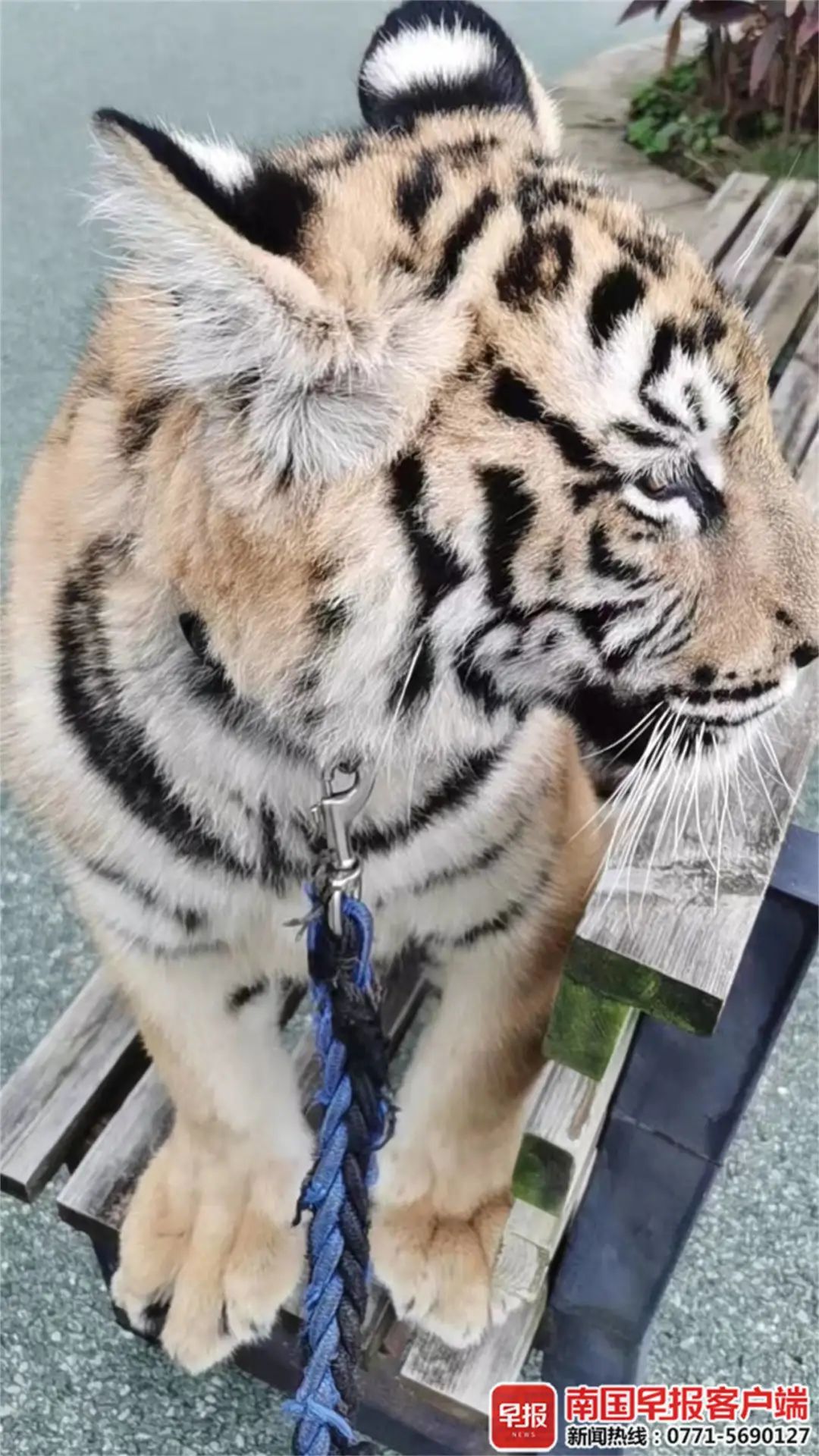 2月8日,平南雄景生态酒店暨平南雄森动物大世界宣传部负责人范斌斌称,“二牛”是华南虎雌性幼虎,目前还不到6个月大。在“二牛”约3月龄起,保育员就会在周末天气好的时候,用电动自行车将它带到园内的大马戏演艺中心广场,跟游客合影、互动,大概半个小时后又将它带回。