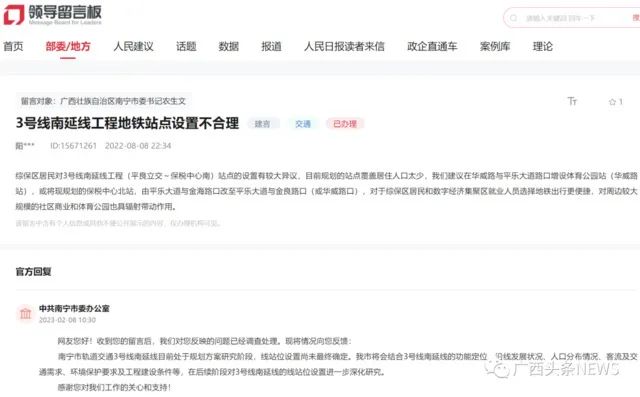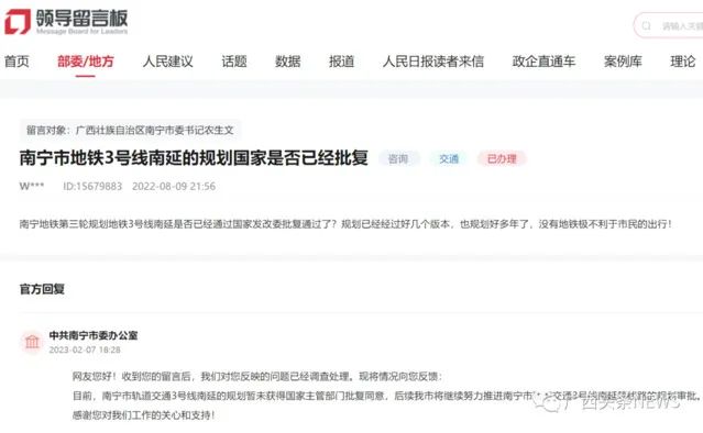 此外,南宁市委办公室2月8日在“领导留言板”针对“3号线南延线工程地铁站点设置不合理”的建言回复称:南宁市轨道交通3号线南延线目前处于规划方案研究阶段,线站位设置尚未最终确定。南宁市将会结合3号线南延线的功能定位、沿线发展状况、人口分布情况、客流及交通需求、环境保护要求及工程建设条件等,在后续阶段对3号线南延线的线站位设置进一步深化研究。