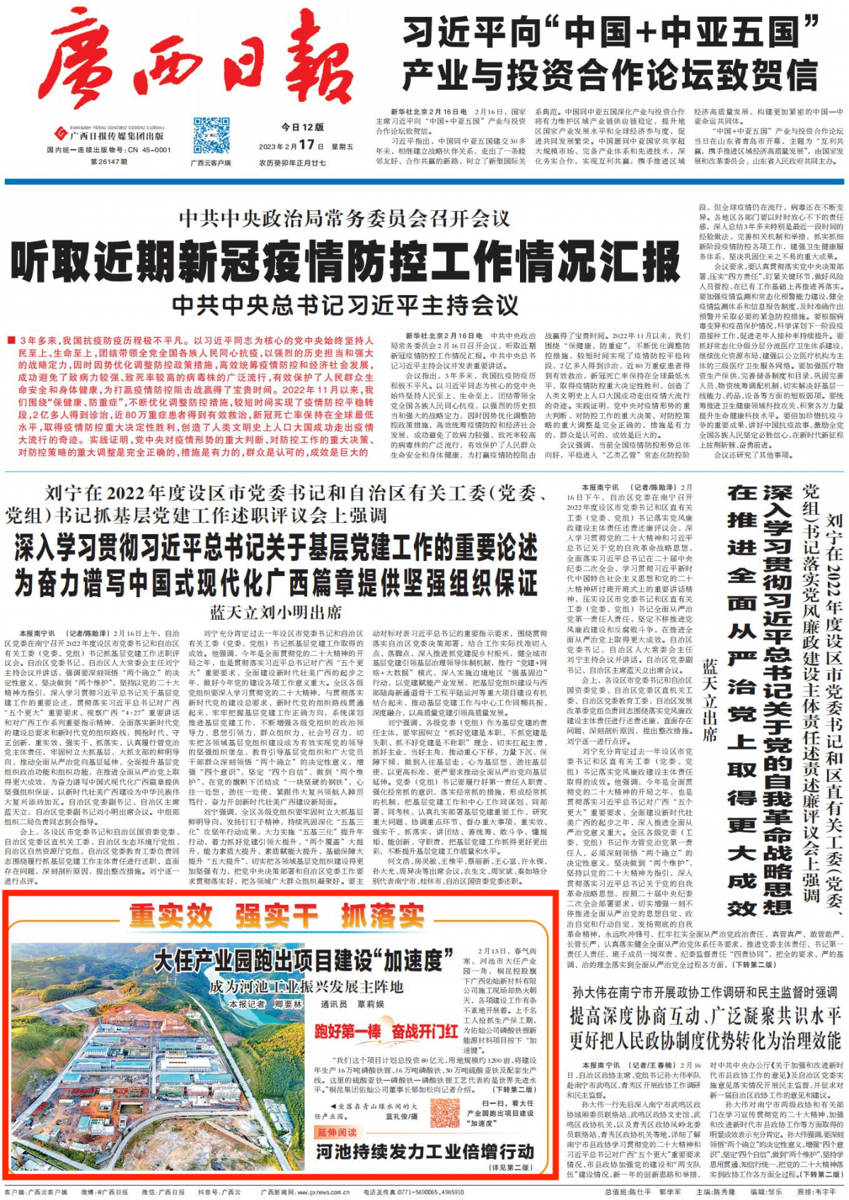 据介绍,该项目自引进到河池市大任产业园以来,河池市委、市政府组织成立项目推动工作专班下沉一线,以“责任清单”定责,项目化落实工作任务,以“问题清单”定改,精准化协调解决问题。工作专班主动靠前协调推动督促,还多次到自治区相关部门汇报沟通,佑灿公司项目的立项、能评、安评、环评、土地指标等前期审批效率大大提高。