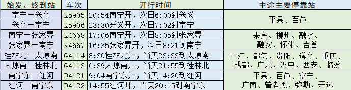 国铁南宁局根据客流摸底调查,加开南宁至兴义K5905/6次、南宁至张家界K4668/7次、南宁东至红河D4121/2次、桂林北至太原南G4114/3次4对旅客列车,方便旅客外出游玩。