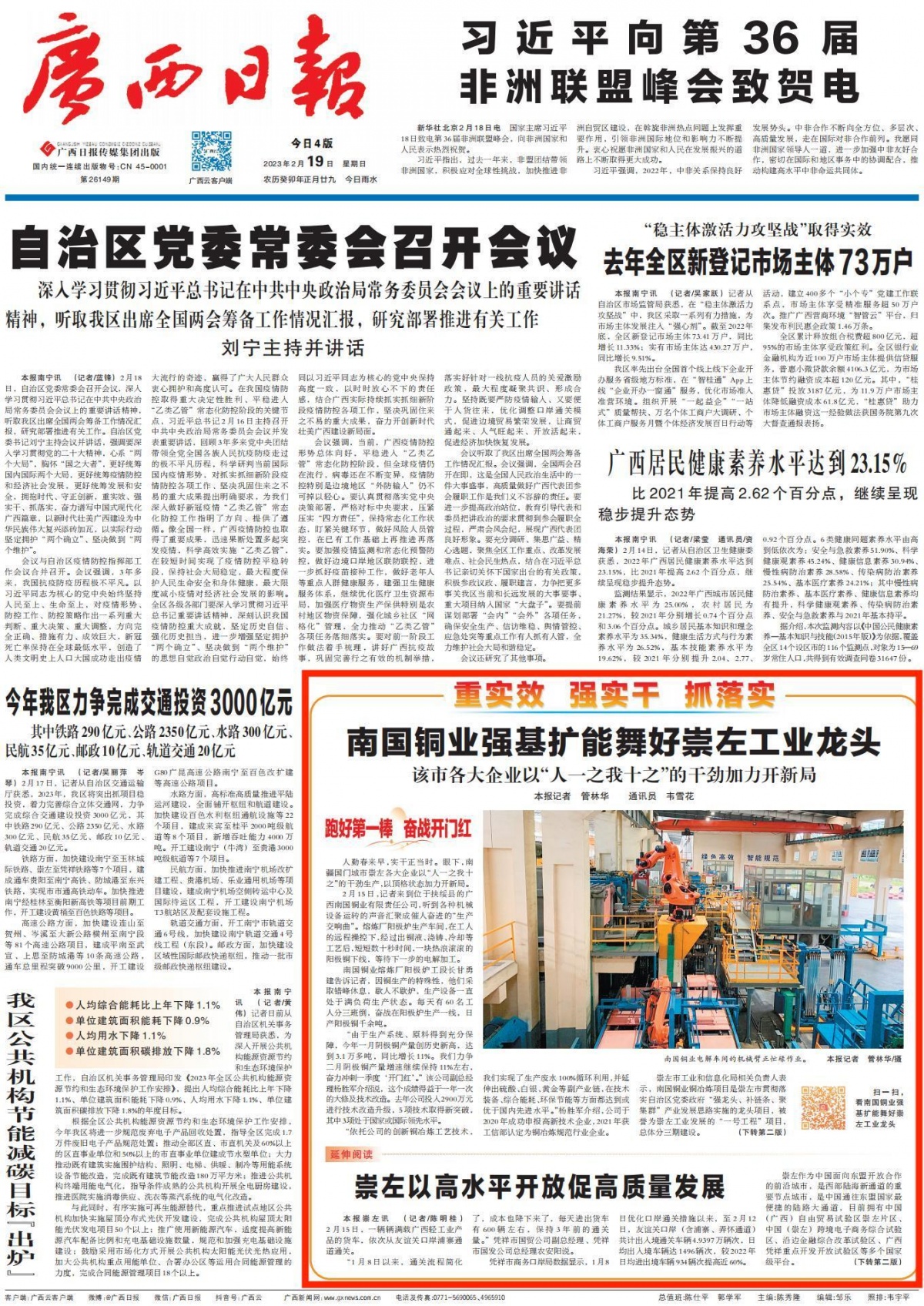 2月2日,崇左市召开以高水平开放促进高质量发展大会,动员全市上下以起步即冲刺、开局即决战的干劲,全力以赴完成全年“6个100”目标,即2023年全市地区生产总值比增100亿元、固定资产投资比增100亿元,财政收入达100亿元、新增规模以上工业企业100家、新增规模以上服务企业100家、百企入边等。