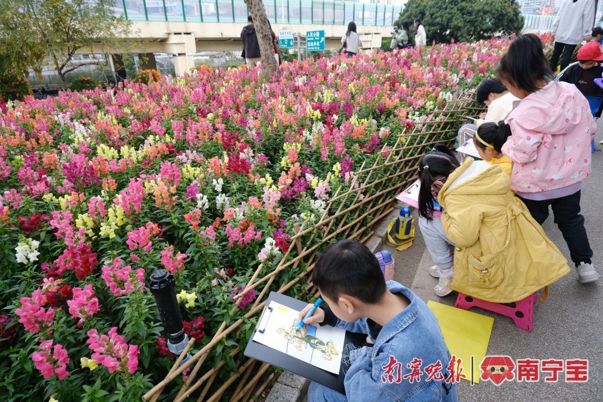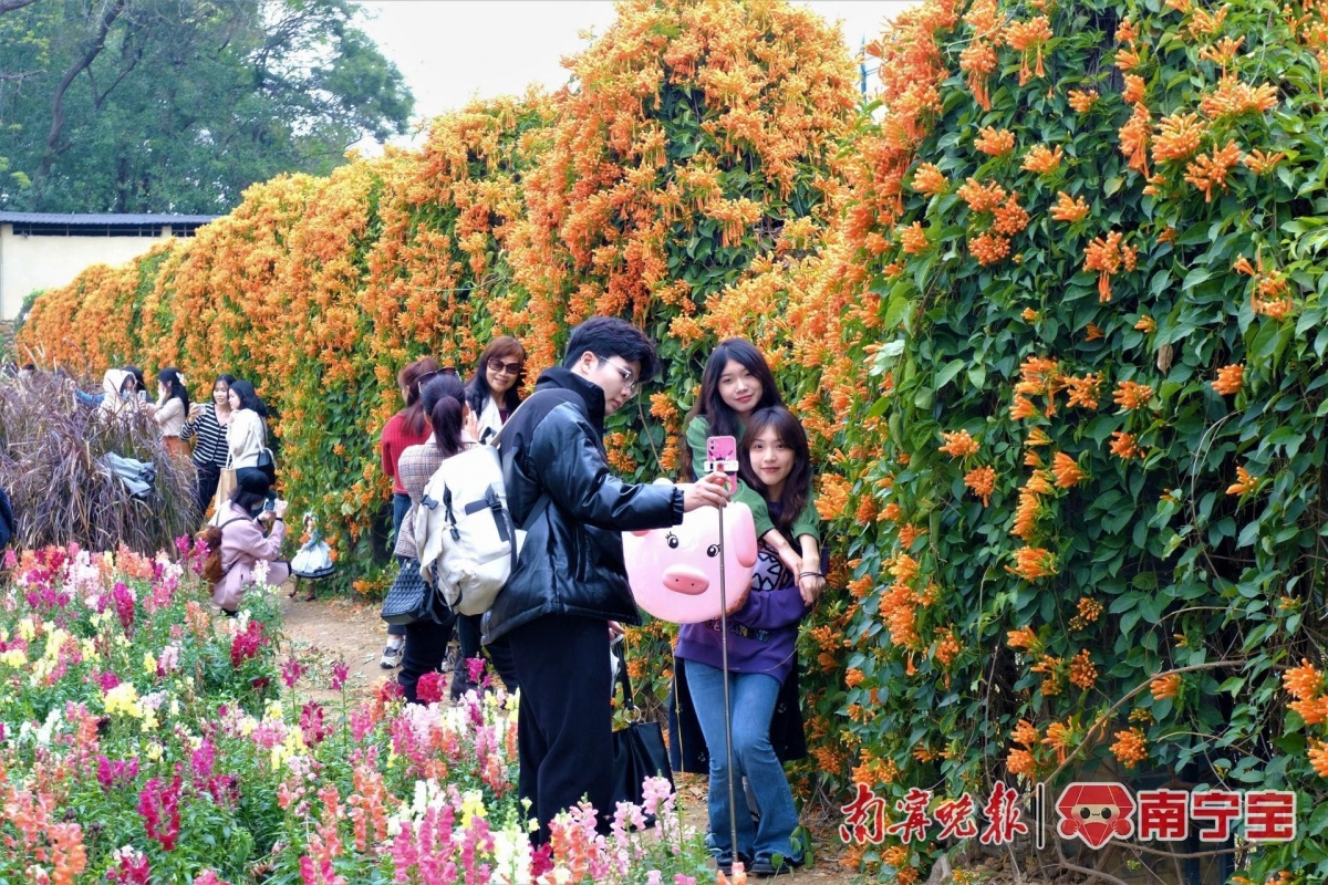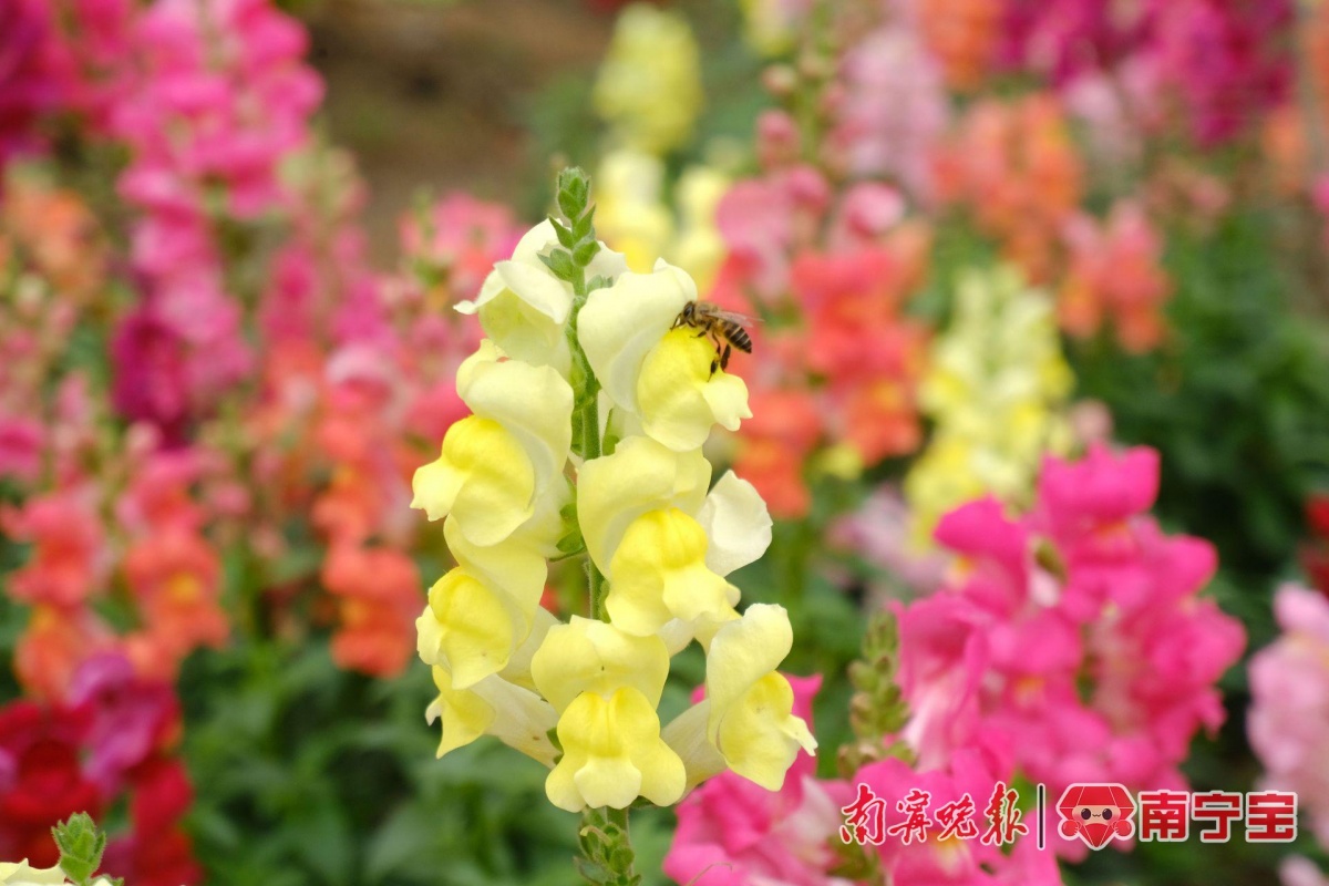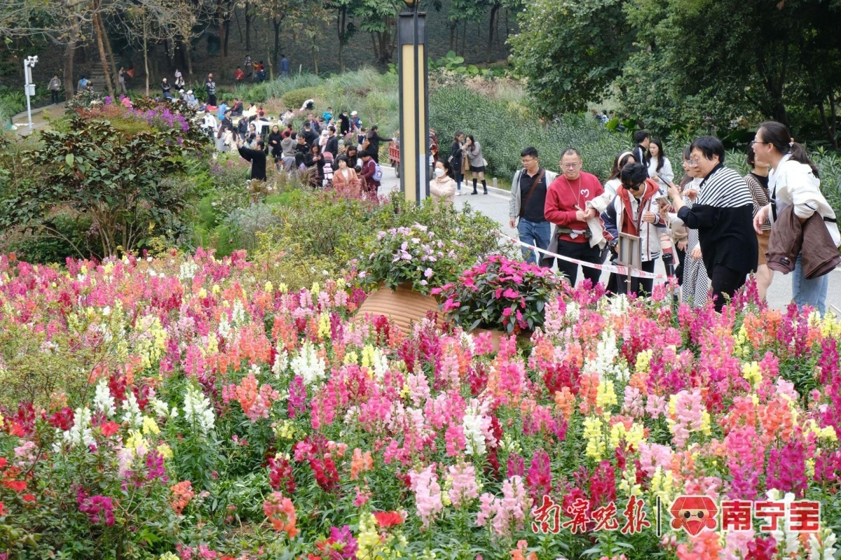 寒冬渐远初春来,最美人间二月花。人民公园东门7万多盆金鱼草迎春绽放,紫色、黄色、粉色、白色,放眼望去,一片五彩缤纷,好似不小心打翻了“调色盘”,更是被市民感叹“现实版莫奈花园”。据了解,南宁市人民公园这片金鱼草花海美景在央视《新闻联播》出镜,向全国观众展示金鱼草花海梯田梦幻的“油画世界”。近段时间以来,赏花“大军”争相来打卡。除了金鱼草,沿着公园园湖路围栏种植的黄澄澄的炮仗花也进入了盛花期。大家赏花时,不仅可以和金鱼草和炮仗花同框,还可以沿着花田间的小路走到围墙边,与花为伍,定格美好瞬间。