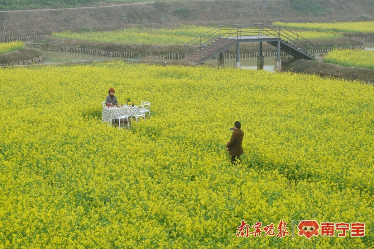 郊外春天来的并不比市区公园、景区的晚。近日,江南区同江村、上林连片的油菜花竞相开放,引得游人纷至沓来。金黄色的油菜花映衬着朵朵白云,在阳光照耀下,黄得耀眼,阵阵微风拂过,散发出淡淡的清香以及泥土的芬芳,沁人心脾,这是春天的气息。