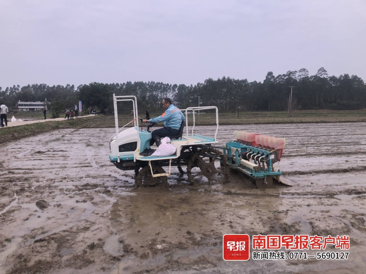 ▲博白县亚山镇民新村春耕现场点正在进行机械化播种。南国早报客户端记者 张文卉 摄