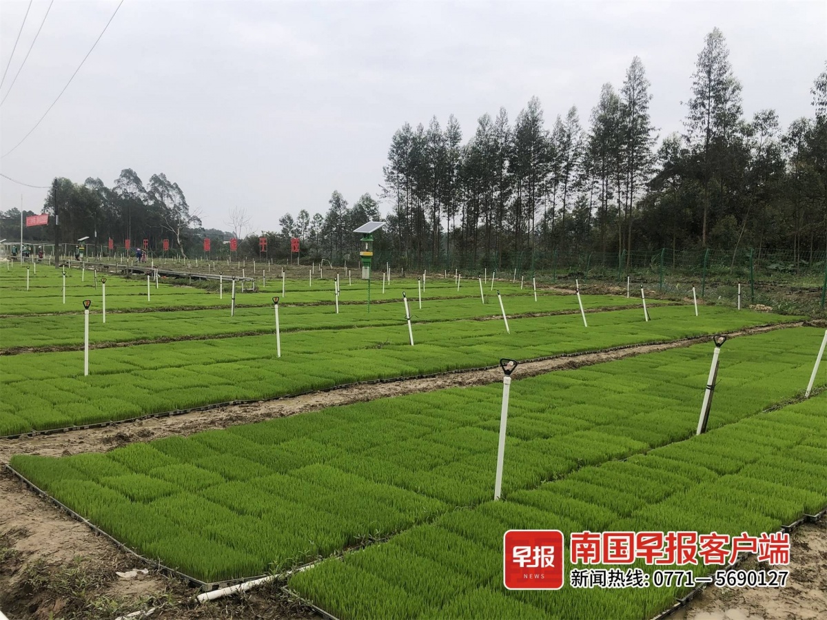 ▲博白县桂客农业种植有限责任公司采用机械化育秧的秧苗已长成。南国早报客户端记者 张文卉 摄