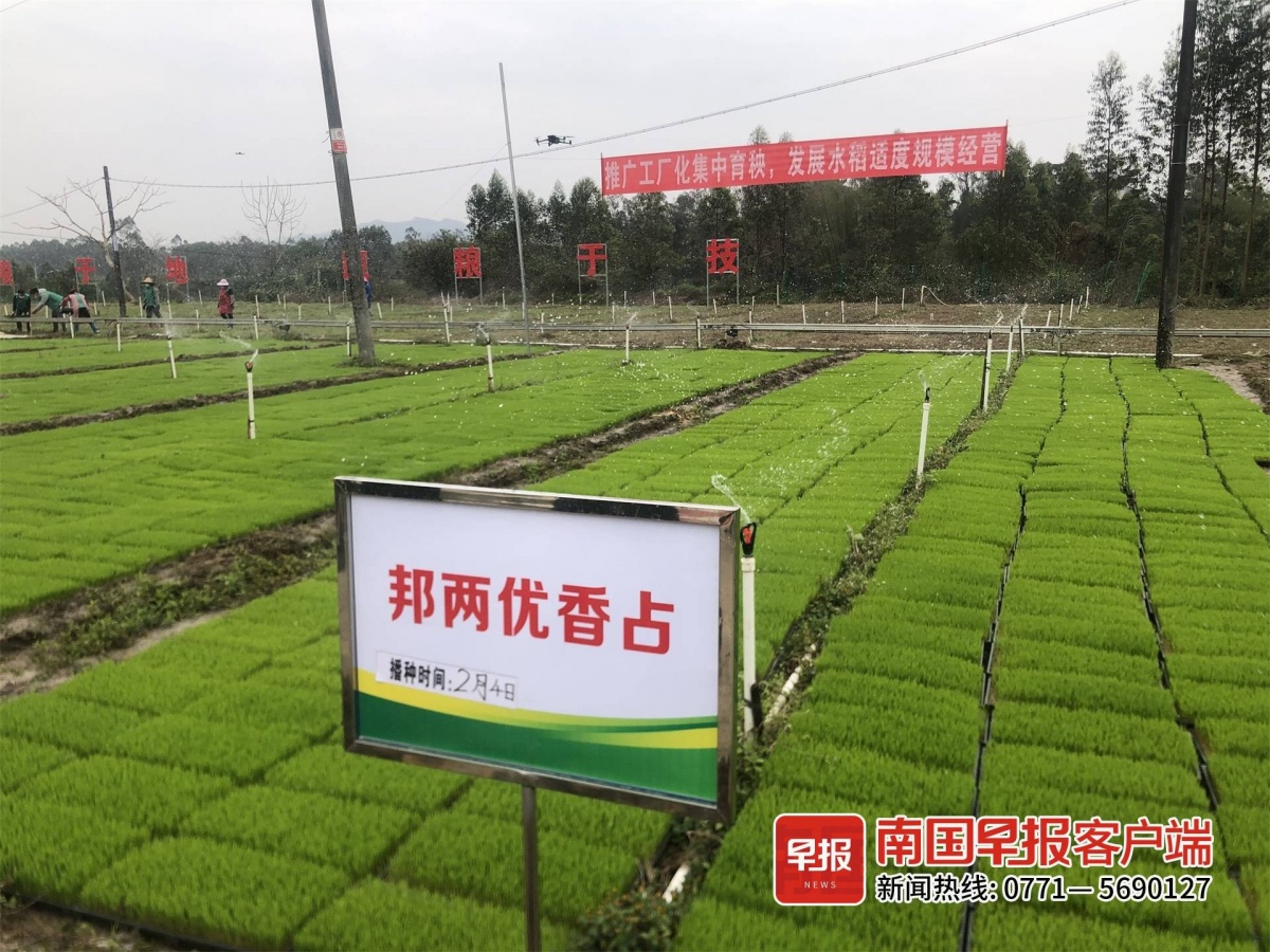 此时,广西大部分地区还在春耕备耕的育秧阶段,待到3月左右,将会进行大规模的插秧。然而,在该基地,长到10厘米左右的馫香优1068已经抛秧到田里,面积约200亩。