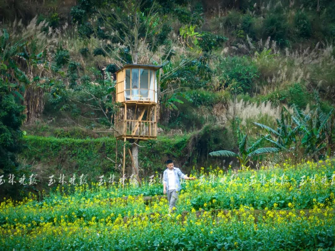 因为周边是邻居家的撂荒地,都乐意给周海锋用。在修建树屋时,周海锋在周围的梯田撒了一亩多的油菜花和格桑花种子。春节过后,油菜花和格桑花陆续开花,周海锋便知道他想要打造的花田成了。时下花开正旺,在树屋下呈梯级分布,非常美。