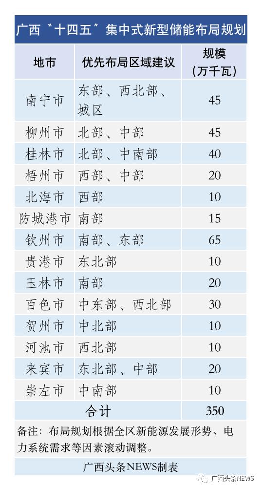 南宁优先在东部、西北部、城区布局,建设45万千瓦新型储能,建设规模和柳州持平,柳州优先布局在北部、中部,规模均居全区第二。桂林市布局在北部、中南部,建设40万千瓦新型储能,规模居第三。