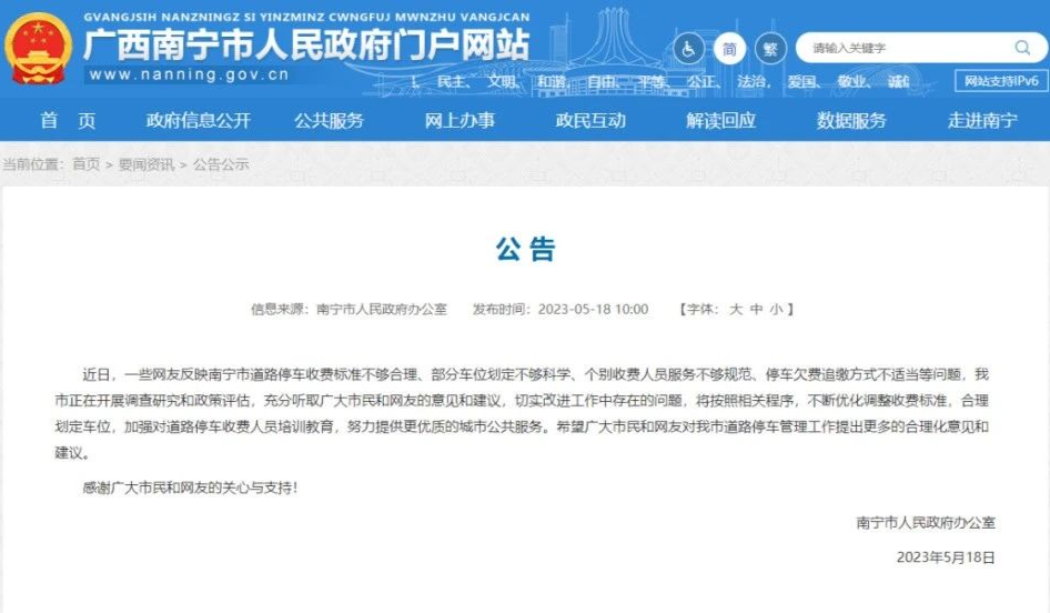 5月18日,南宁市人民政府办公室就道路停车管理工作发布最新公告。全文如下: