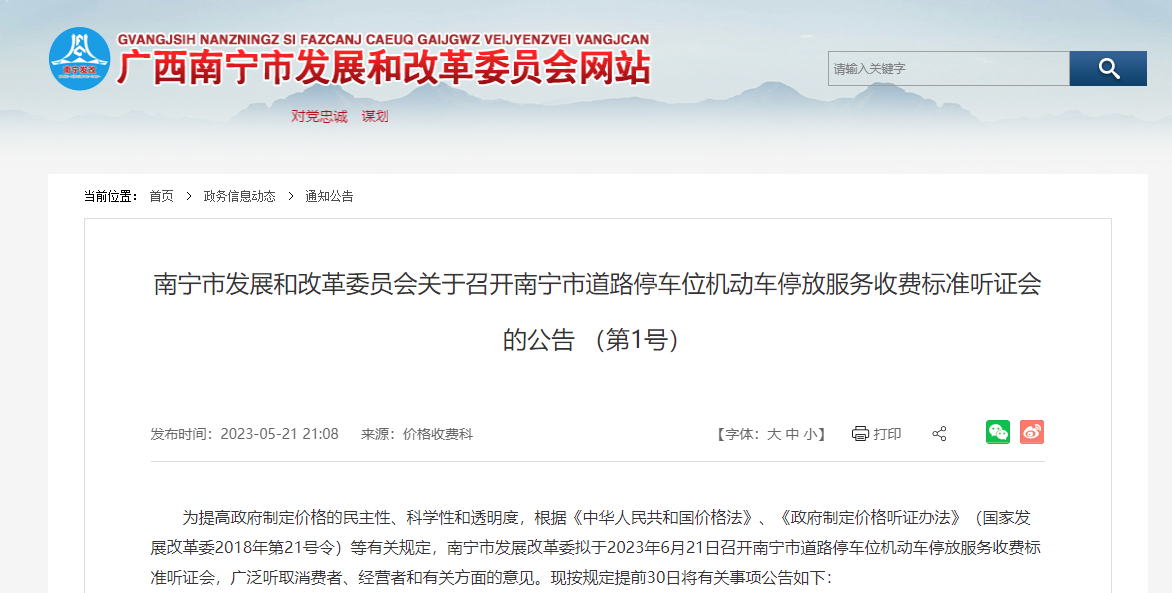 为提高政府制定价格的民主性、科学性和透明度,根据《中华人民共和国价格法》《政府制定价格听证办法》(国家发展改革委2018年第21号令)等有关规定,南宁市发展改革委拟于2023年6月21日召开南宁市道路停车位机动车停放服务收费标准听证会,广泛听取消费者、经营者和有关方面的意见。现按规定提前30日将有关事项公告如下: