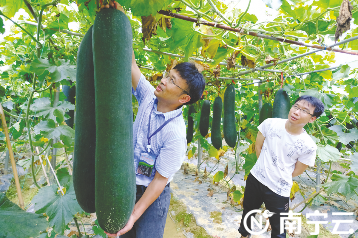 “广西光温资源非常丰富,给黑皮冬瓜种植带来了天然优势。它一年可以种植两季。因为错峰上市,所以价格好、收益高。”吴永官告诉记者,广西农业科学院蔬菜研究所是最早开展冬瓜品种选育研究的研究所之一,选育了一批以“桂蔬7号”为代表的抗病、优质、高产的黑皮冬瓜新品种。桂蔬系列冬瓜品种优点突出,深受市场欢迎,其中“桂蔬7号”已成为华南冬瓜产区的标杆品种。目前,各桂蔬系列品种已经成功转化,转化总金额超过100万元,是广西少有的转化金额达到百万元以上的蔬菜新品种之一。以“桂蔬7号”为核心技术之一的科技成果“冬瓜优异种质创新、多样化品种选育及提质增效技术研究与应用”获得2019年度广西科技进步一等奖。