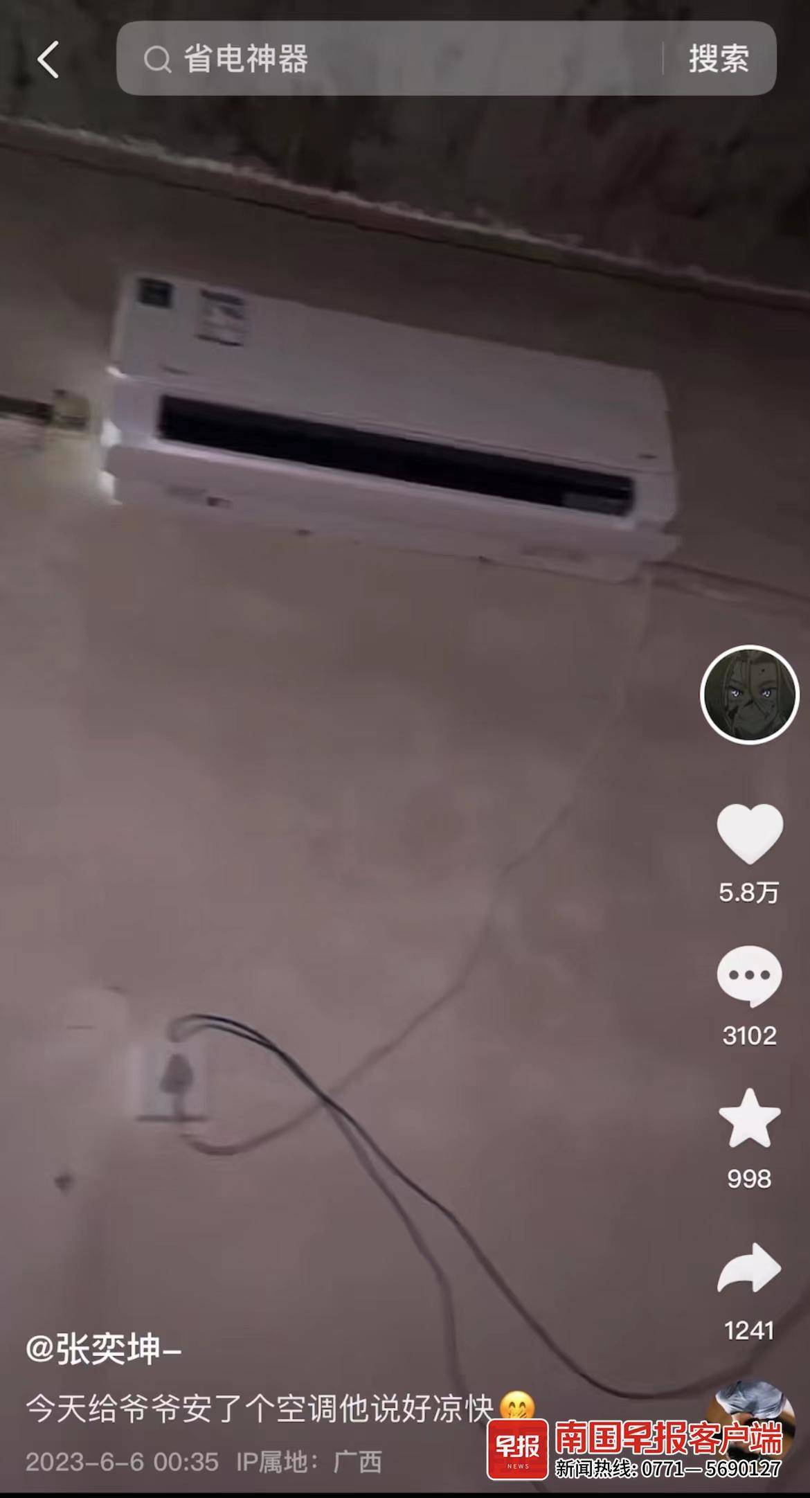 6月5日下午,安装师傅将空调装好后,张奕坤随手拍下了视频,并配文:“今天给爷爷安了个空调,他说好凉快。”发布到自己的朋友圈和短视频平台后,没想到短短一天就收获了近6万人点赞。对此,张奕坤感到很意外:“我就是像平常一样随手拍随便发,视频火了之后,感觉就像是中了彩票。”