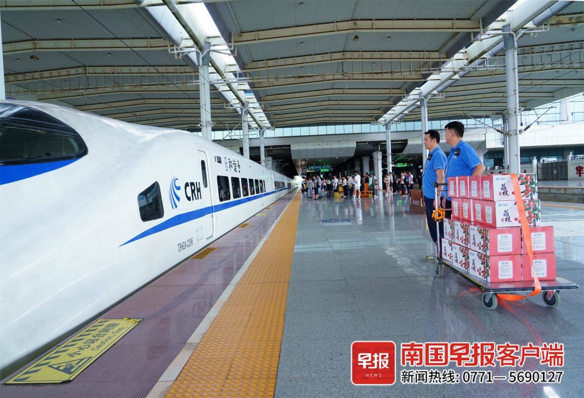 工作人员将包装好的灵山荔枝送上站台。程睿哲 摄