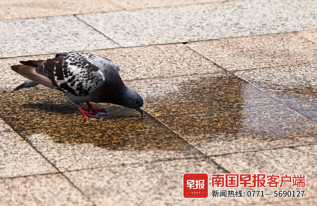 ▲南宁民族广场上,一只鸽子正在雨后的积水里饮水。记者 游拥军 摄