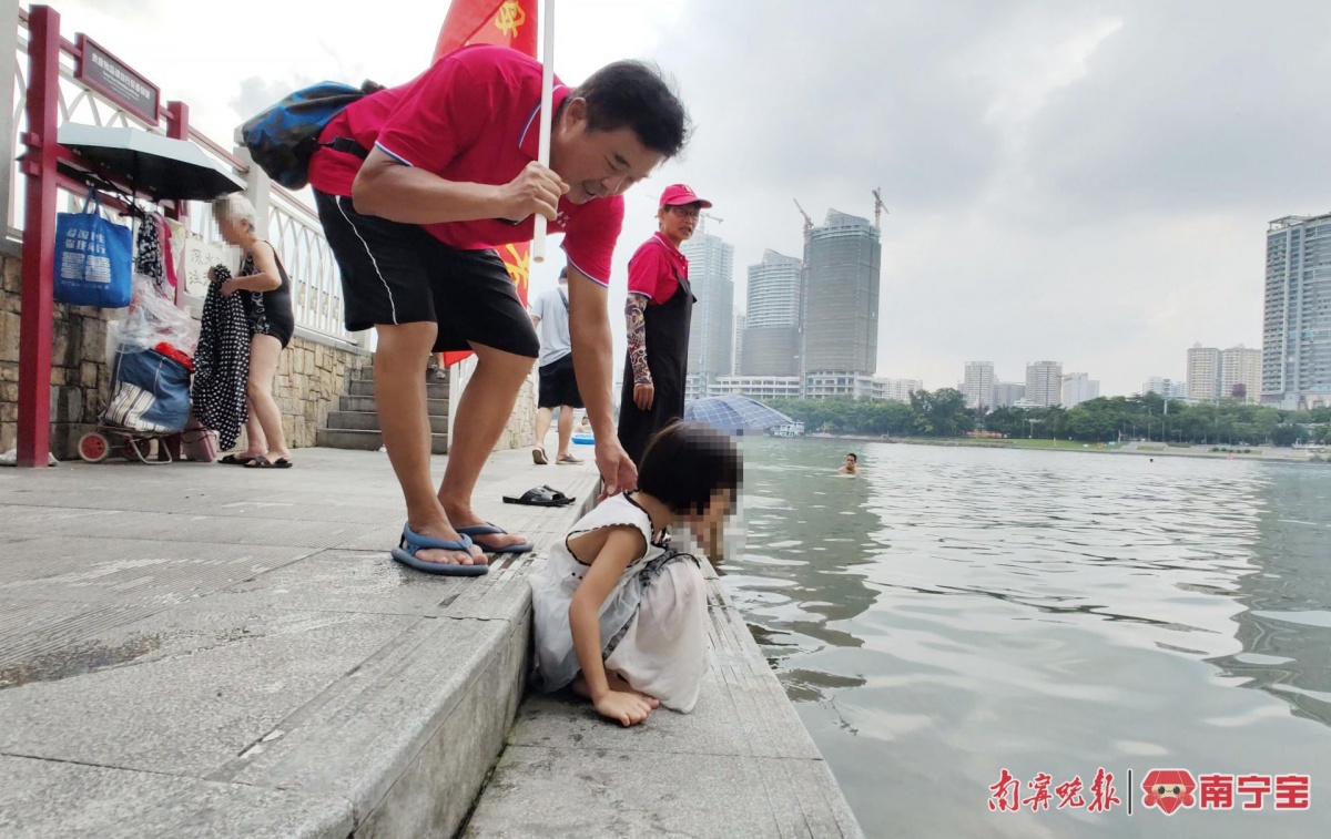 在邕江大桥南上游的亲水平台,还有不少市民带着一个甚至两个小孩前来嬉水。其中,一名30多岁的女子带着两个年幼的儿女,坐在亲水平台的台阶上嬉水,稍大点的女儿(年约5岁)不时擅自跑到一二十米外自己嬉水,而该女子带着小儿子,根本无暇顾得上女儿。