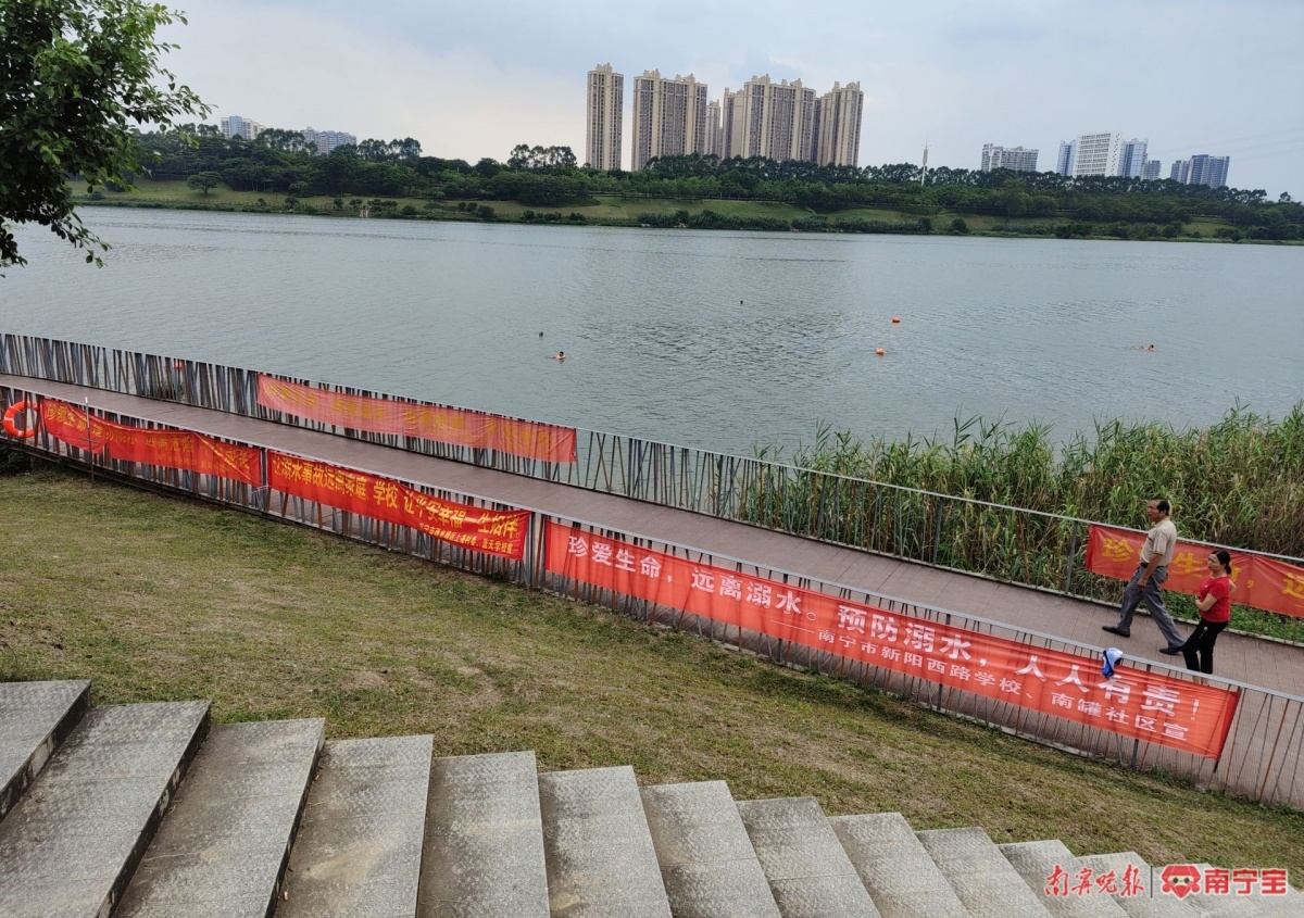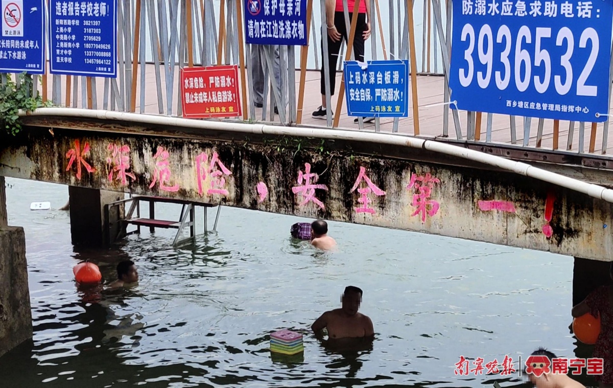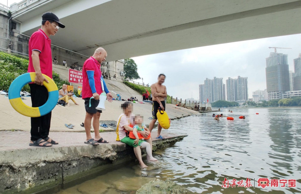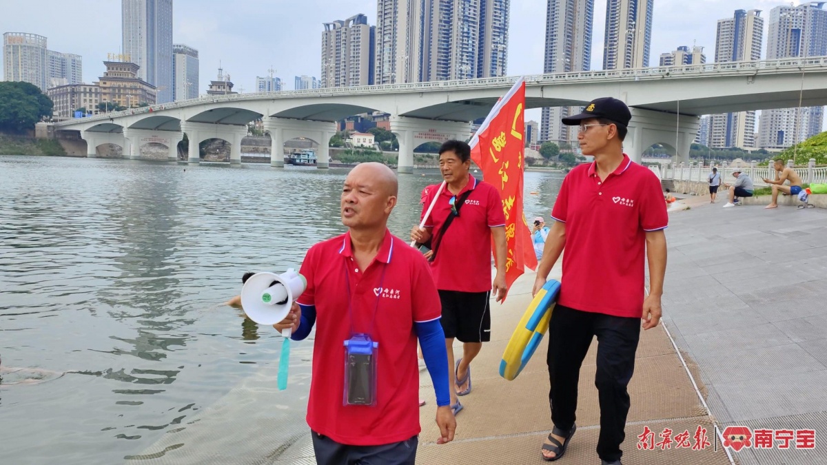 "注意安全,预防溺水,带齐设备,安全游泳。""水深危险,请家长们看护好小孩,预防溺水。"……在岸边,志愿者沿着邕江河岸逐一提醒前来游泳嬉水的市民和宣传预防溺水知识,并有选择性地对那些年纪较轻或水性不好的人进行劝阻远离危险。