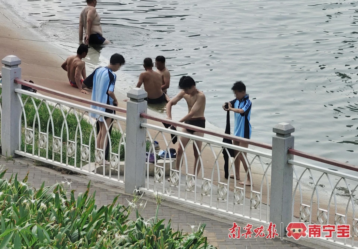 6月15日下午,记者来到邕江大桥南一探究竟。当天16时,记者来到邕江大桥南桥底水域时,已经有不少市民在此嬉水游泳。在岸边浅水区,4名初中生模样的少年,在没有任何设备的情况下,相互追逐嬉水。