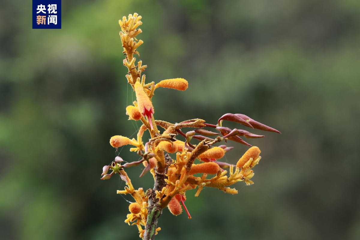 近日,广西崇左弄岗国家级自然保护区巡护员在日常巡护过程中,发现一株全株呈橙红色的植物。发现时,该植物正处于盛花期,花量密集,且只见开花而未见有绿叶。在后续监测过程中,又在附近不到500米范围内记录到4株同类植物。后经中国科学院广西植物研究所植物专家鉴定,确定该植物为广西火桐,是中国国家一级保护野生植物。