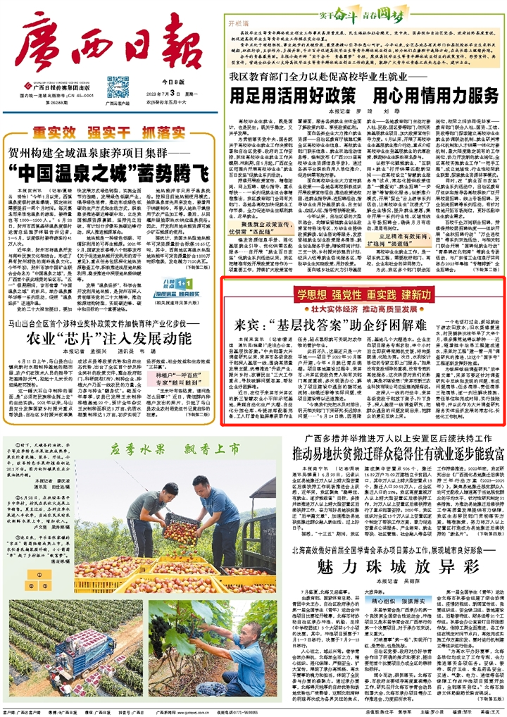 “走出办公室,到基层找答案。”中央部署大兴调查研究以来,来宾市各级党政干部深入基层一线,围绕高质量发展主题,统筹推进“升级产业、振兴乡村、改善民生”三大工作重点,寻找破解问题答案,帮助企业纾困解难。