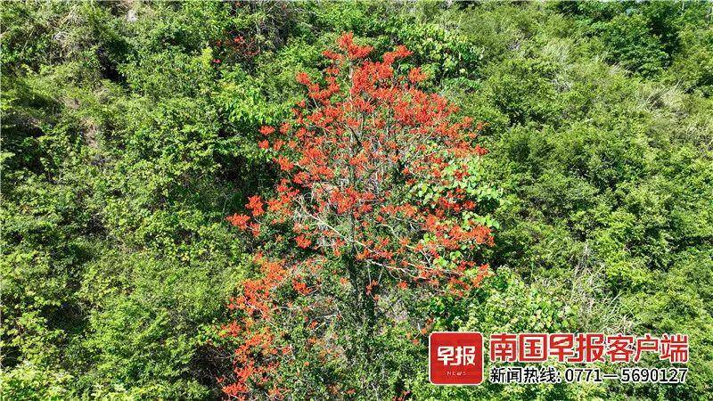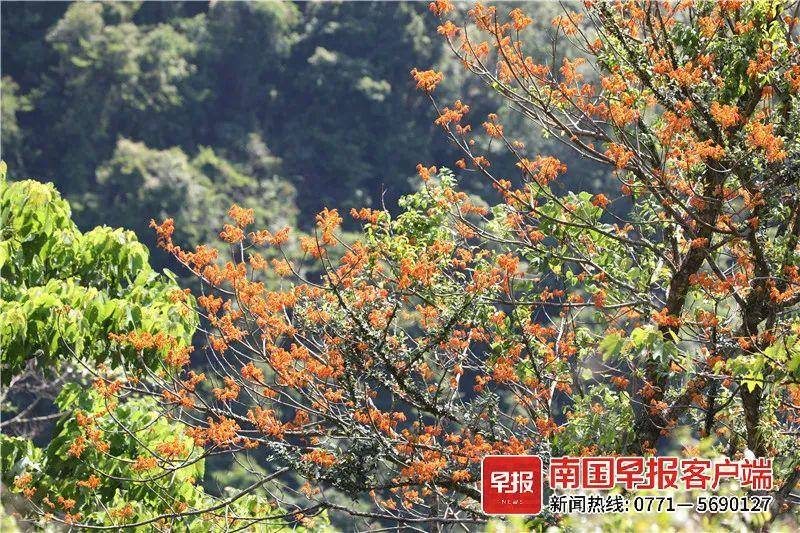 近日,位于祖国南疆的广西百色靖西市古龙山景区内,苍翠的山林里掺杂着片片火红,原来是数百株野生广西火桐竞相盛放,在一望无垠的原始森林里相当显眼。