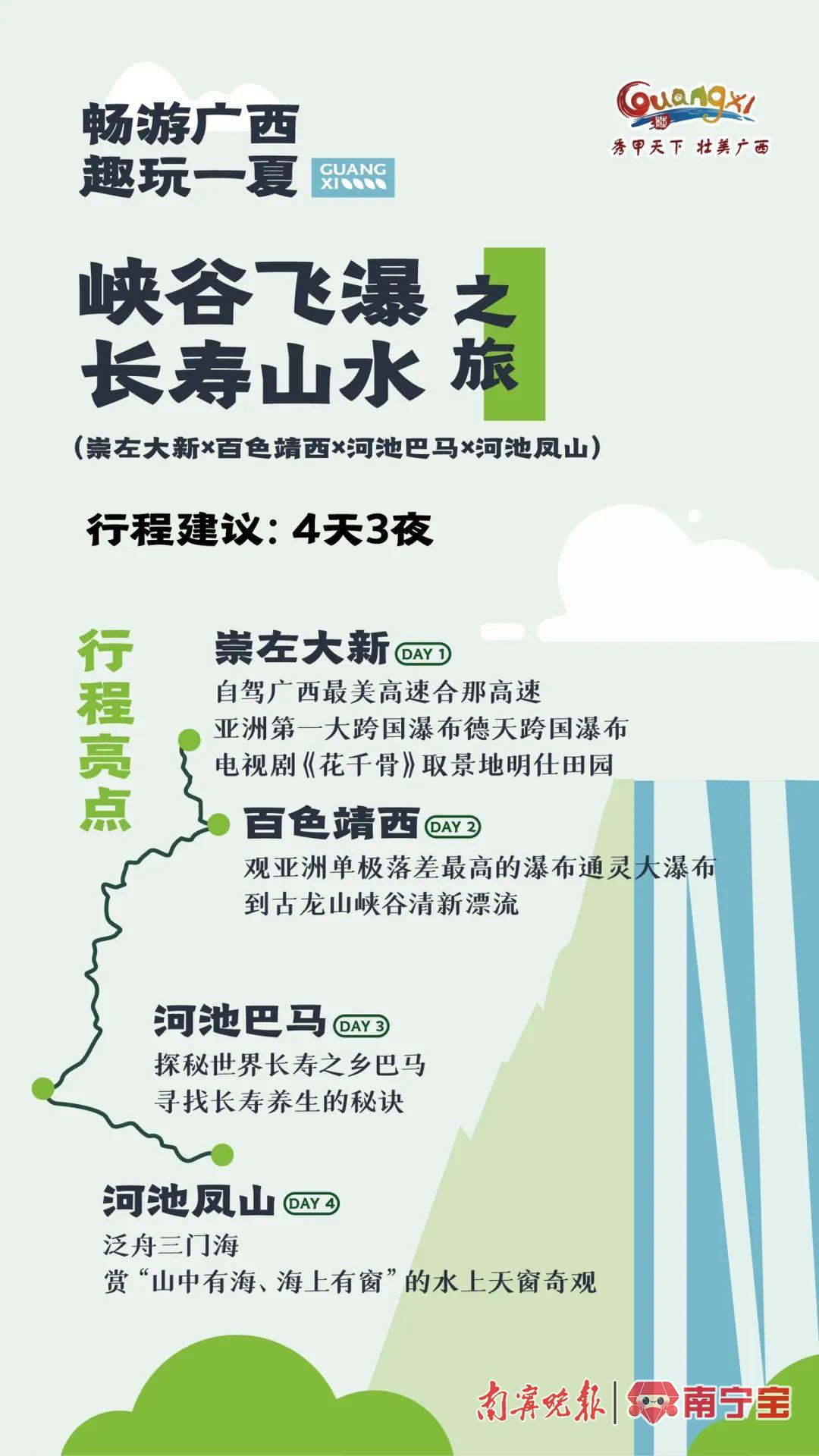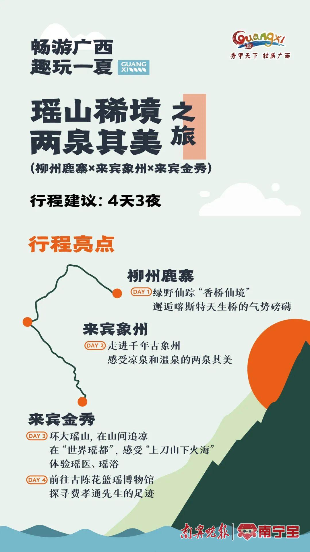 小暑至,盛夏始!7月8日,记者从广西文化和旅游厅了解到,广西推出4条清凉避暑旅游精品线路,分别是“瑶山稀境”两泉其美之旅、“峡谷飞瀑”长寿山水之旅、“茉莉香妃”横容双州之旅和“赤水丹泉”山行秘境之旅,邀你沁爽一夏,沁人心脾,浸在广西最舒适。