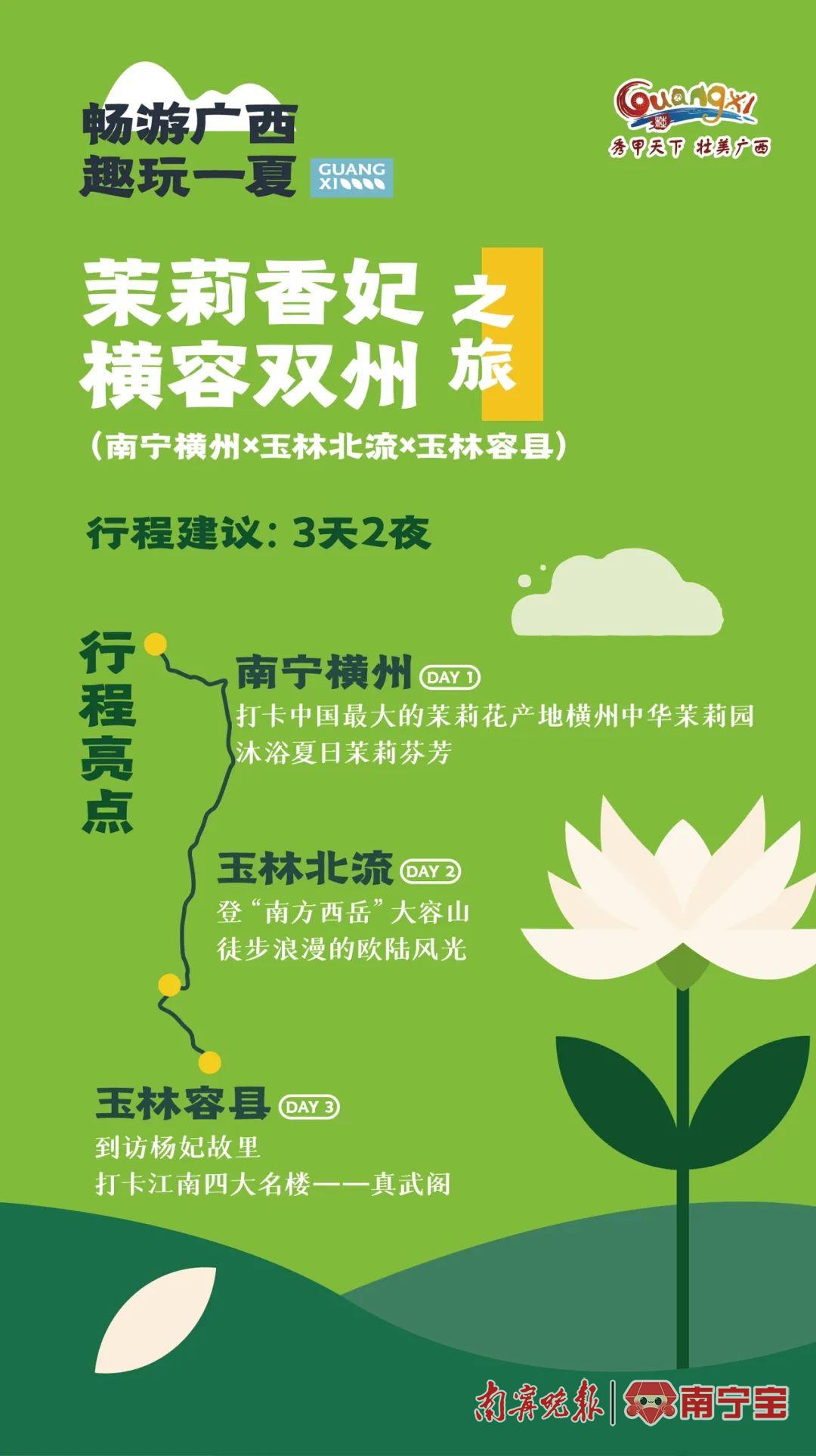 行程亮点:前往横州市,打卡横州中华茉莉园,游西津湖湿地公园,前往西津电厂享用非遗横州鱼生、横州大粽,傍晚登上圣茶山,赏圣山西津日落;驾车前往北流,登南方西岳——大容山,体验桫椤谷漂流;容县,打卡江南四大名楼——真武阁,逛容州古城,登都峤山,体验刺激的索道缆车。