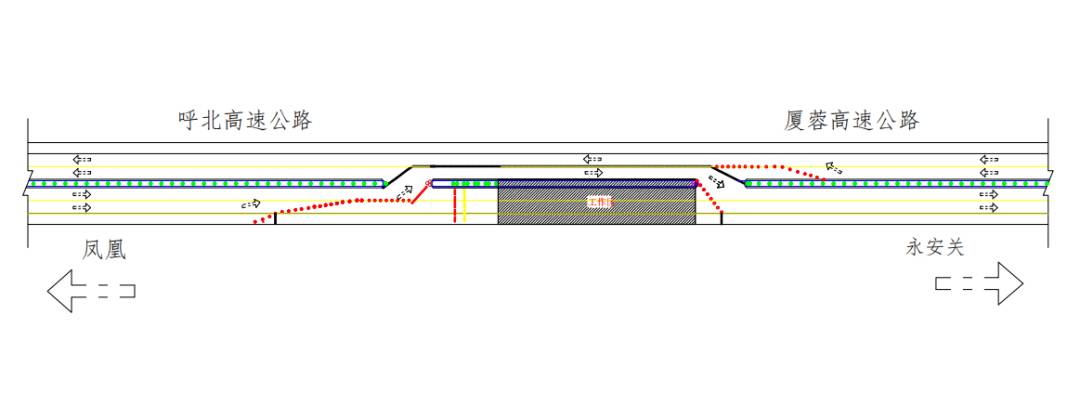 永安关往凤凰左幅(下行线)车辆从呼北高速K2241+550~K2241+620活动开口汇流进入到右幅(上行线),右幅(上行线)实行双向两车道通行。左幅(下行线)车辆从厦蓉高速K860+980~K861+050活动开口处重新汇流进入到左幅(下行线),完成借道绕行。