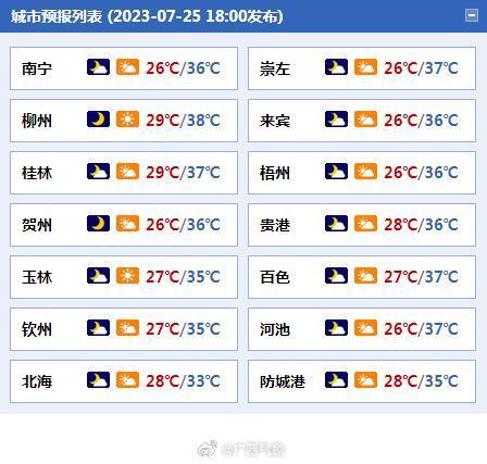 今天(25日)白天广西维持高温热浪,08-16时最高气温,全区90个国家气象观测站中有57站≥35℃,其中气温最高的出现在阳朔、鹿寨,达到了37℃。预计未来三天,广西以高温少雨天气为主,大部最高气温35~37℃、局地38℃以上。