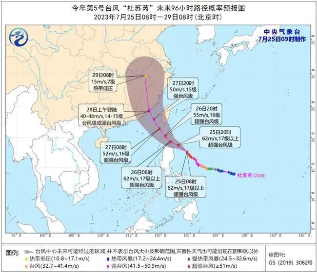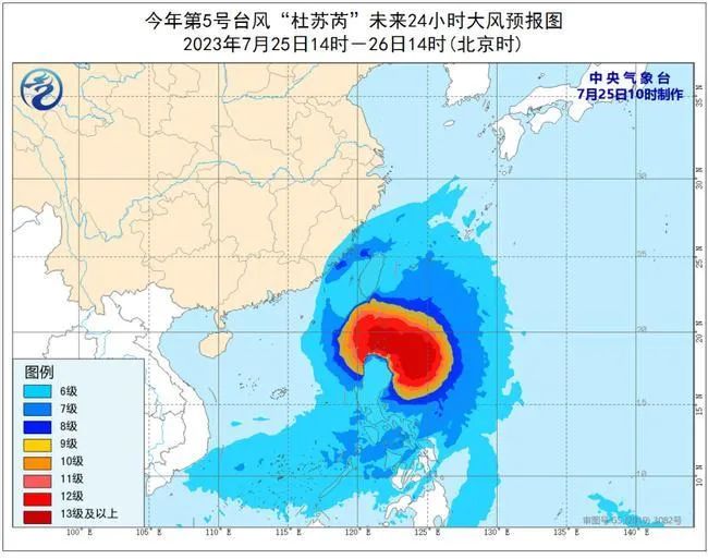 今年第5号台风“杜苏芮”(DOKSURI)(超强台风级)的中心今天(25日)上午8点钟位于我国台湾省鹅銮鼻东南方大约620公里的菲律宾吕宋岛以东洋面上,就是北纬17.6度、东经124.6度,中心附近最大风力有17级以上(62米/秒),中心最低气压915百帕,七级风圈半径300-450公里,十级风圈半径120-180公里,十二级风圈半径90-120公里。