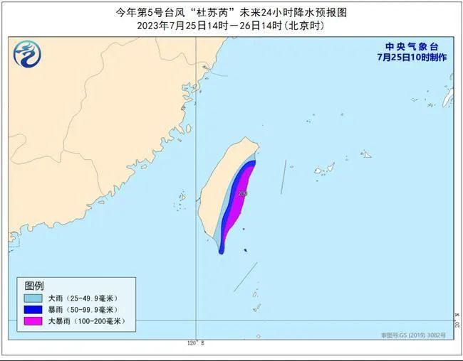 降水预报:25日14时至26日14时,台湾岛东部有大到暴雨,部分地区大暴雨(100-200毫米)。