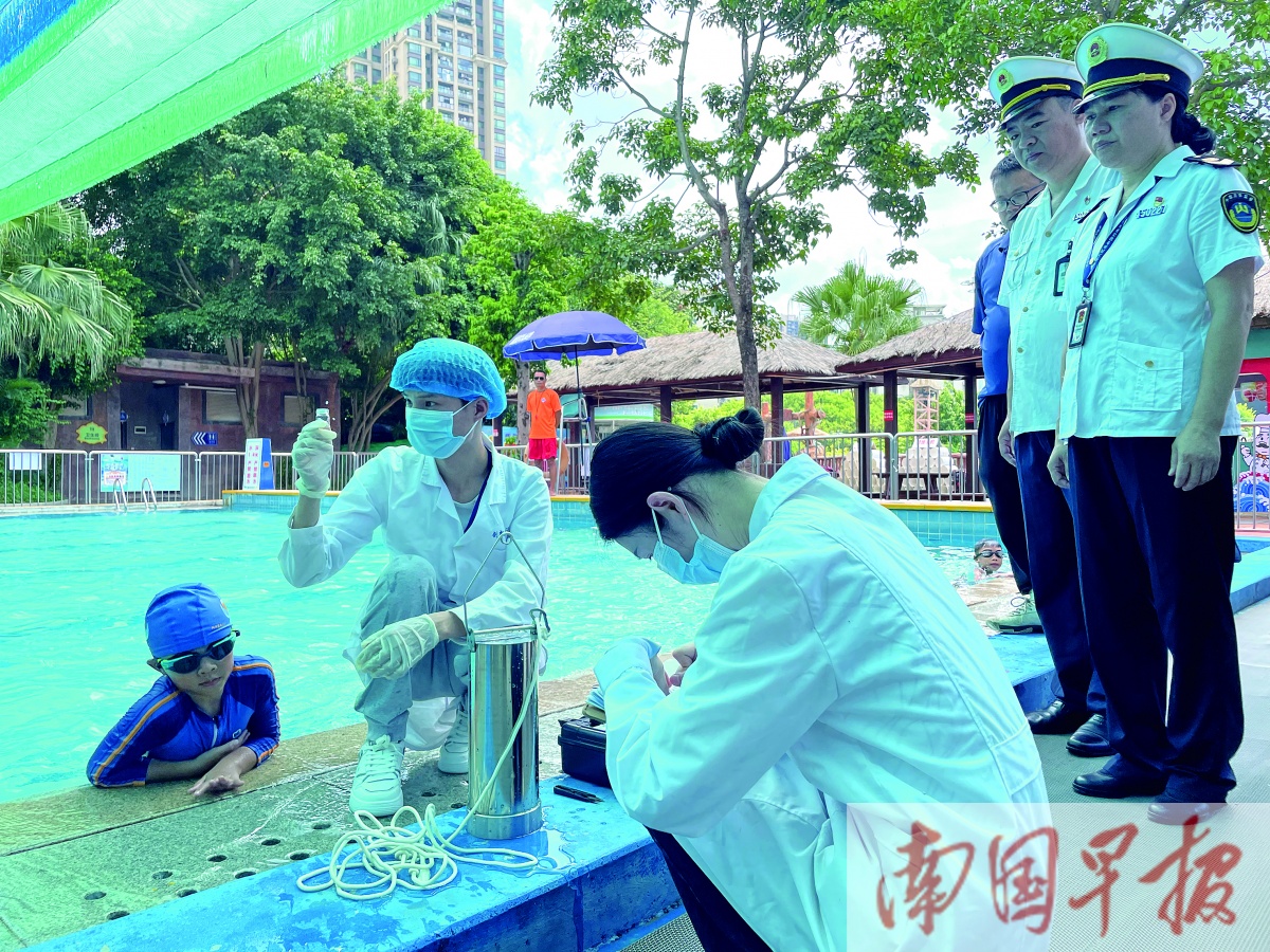 当天上午10时许,在凤岭儿童公园丽紫欢乐水世界,执法人员看到入口处的卫生信息公告栏上写的是7月24日的水质信息,当场要求管理方每天相隔两小时对水质进行检测,并及时更新信息。随后,在公共游泳池、浸脚池,工作人员现场检测,显示余氯值均符合卫生标准。