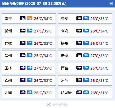 7月30日晚上到7月31日白天,北海、钦州、防城港、玉林、南宁、崇左、百色、河池等市的部分地区有中雨、局地暴雨到大暴雨,广西其它地区多云有阵雨或雷雨、局地大雨到暴雨。