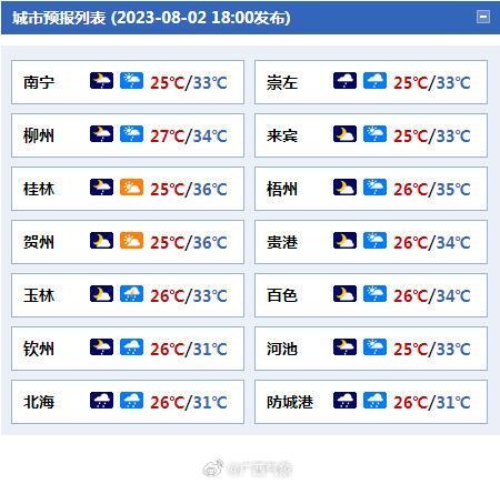 8月3日、4日:受热带云团影响,南宁市多云有阵雨或雷雨,局地大雨或暴雨。最低气温26℃,最高气温32~34℃。