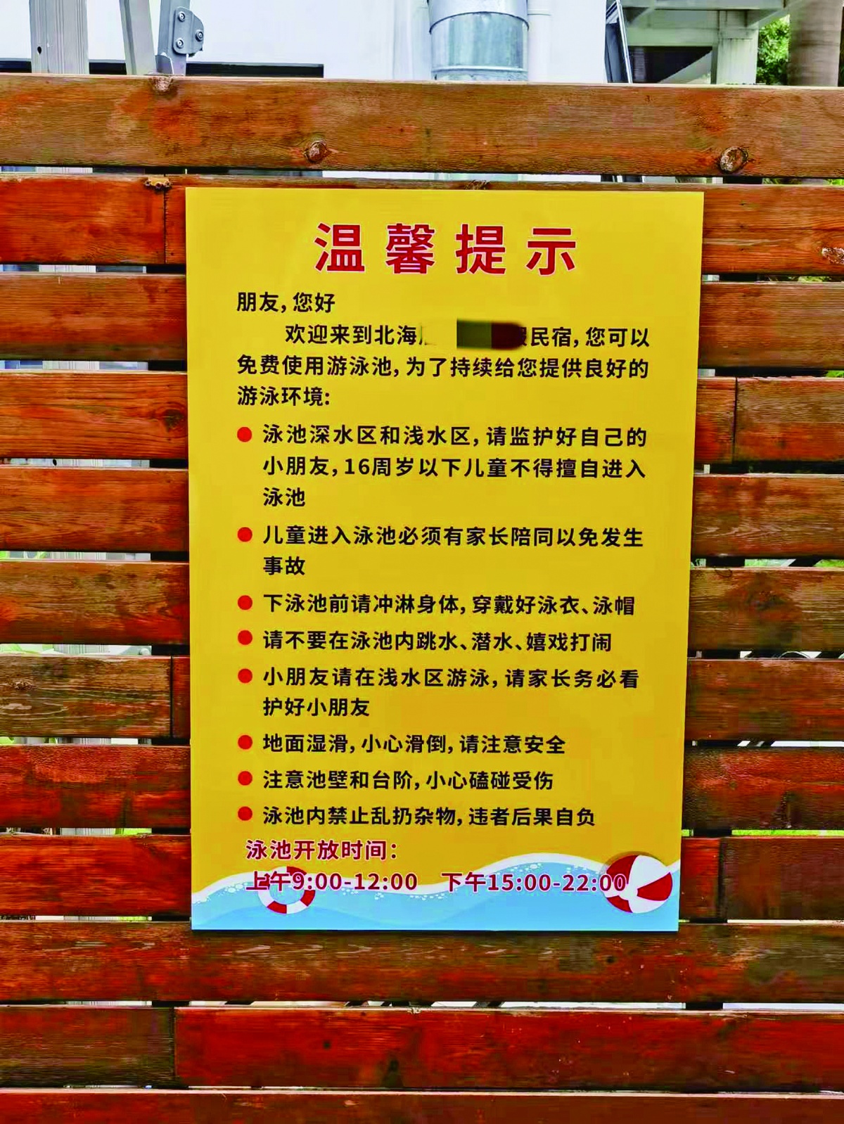 “民宿经营者现在也很重视泳池安全管理,很多泳池都会有使用须知、安全警示标识、水深标识牌和相应救生设施等,有条件的民宿也配有安全员在泳池使用高峰期进行巡查。”周子文说,当前,民宿泳池多以自我管理为主,经营者和服务人员要提高安全和卫生意识,监管部门也应考虑到民宿泳池的实际情况,出台符合民宿现状的管理措施。