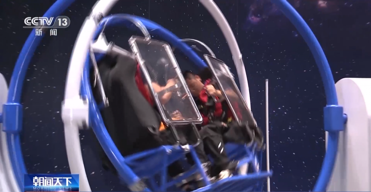 在展厅四层的这个三维滚环展品,模拟了航天员的训练过程。这件展品由蓝色外环、白色中环和蓝色内环组成,内环上的一组座椅供观众体验。这件展品的核心检查在于设置在内部的传感器。