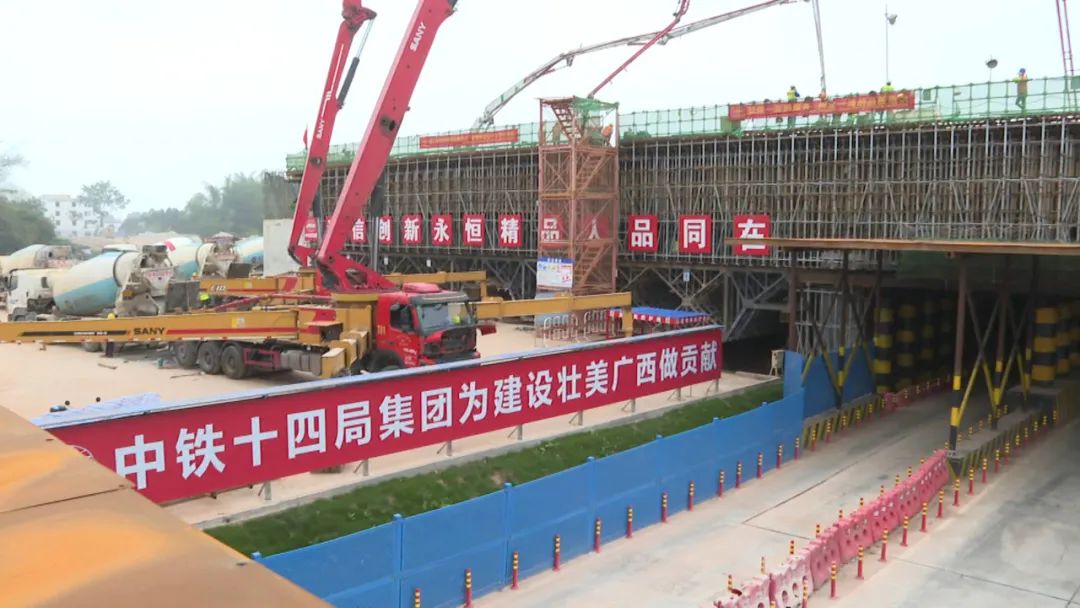 广西机场管理集团建设工程指挥部工程部副经理黄勇:至8月14日下午,南宁吴圩机场改扩建工程B线滑行道桥箱梁整体浇筑完成,这座国内目前为止单跨最大的飞行滑行桥浇筑完成,标志着南宁机场改扩建工程北侧滑行桥箱梁施工已基本进入尾声。