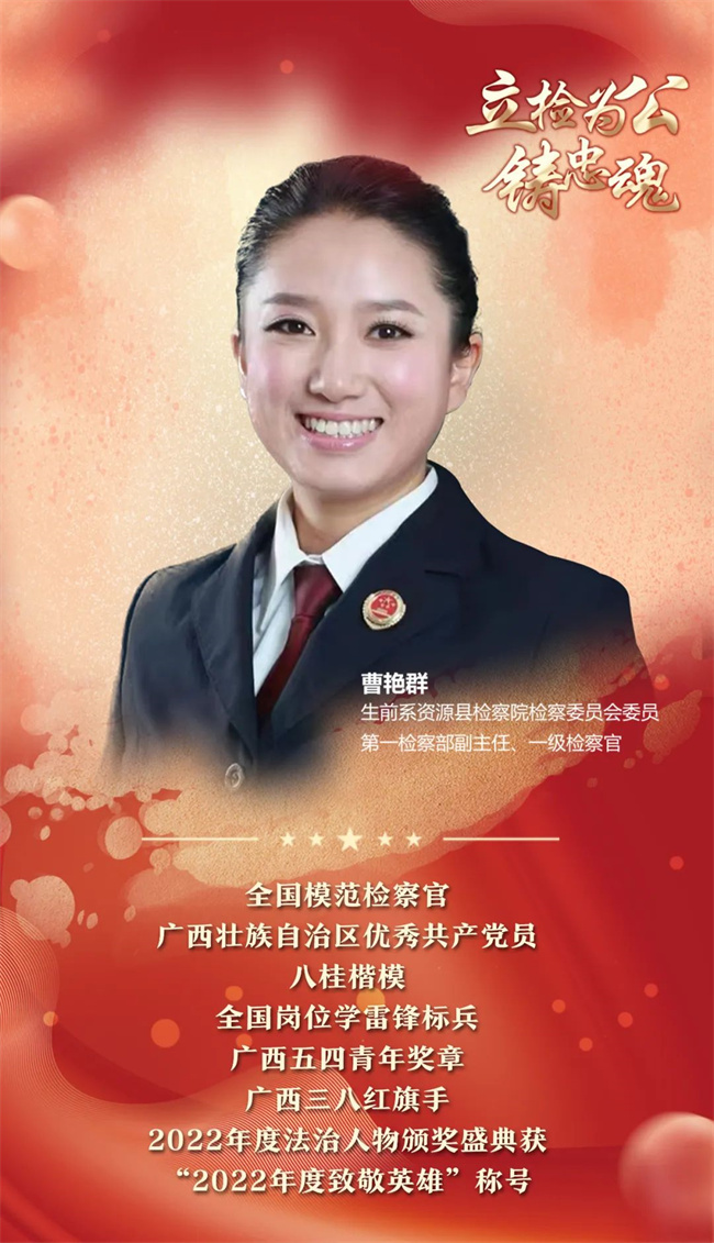 曹艳群,扎根艰苦山区13年,直到以身殉职。她对党忠诚,政治品格坚定,初心如磐始至终;她厚植为民情怀,心中装着群众,凡事想着群众;她恪守法治信仰、维护公平正义,一生秉公办案;她勇于担当、坦荡无私,始终敬业清廉。她是新时代检察机关模范践行习近平法治思想、扎根基层为民司法的先进典型,先后被追授为“全国模范检察官”“广西壮族自治区优秀共产党员”“八桂楷模”。今年5月,中央政法委印发通知,号召各级政法机关和广大政法干警向曹艳群同志学习。《检察日报·先锋周刊》编辑部从广西壮族自治区检察院不久前举行的曹艳群先进事迹报告会上,选取了4段感人故事,一起来感受。