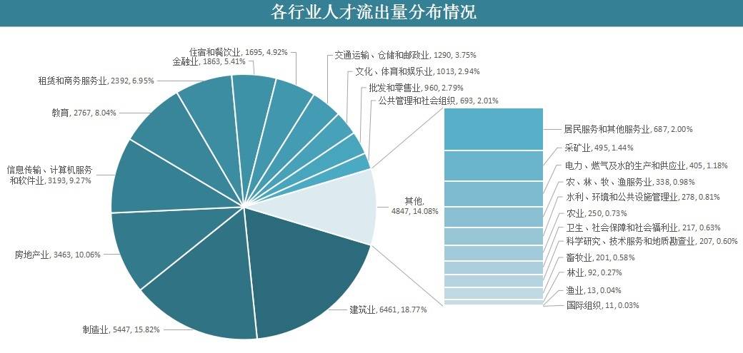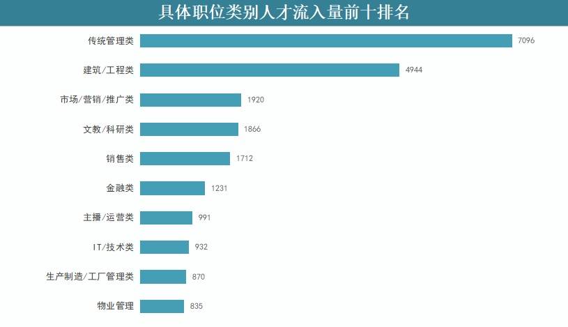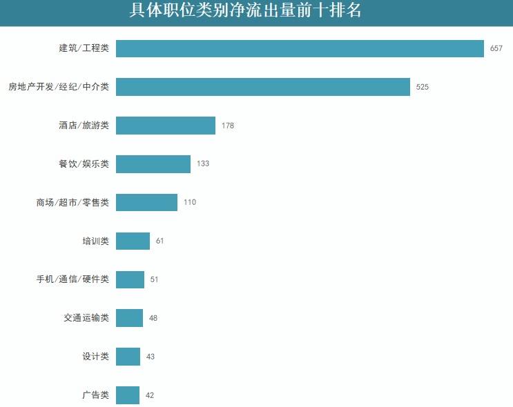 从职位来看,传统管理类包括财务/税务/审计/统计、行政/文职/后勤和人力资源/人事等类别由于其稳定性强的特点,成为人才净流入最多的职位类别;建筑/工程类职位人才流出明显。