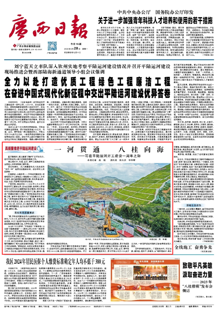 广西所盼、桂运所系——2022年8月28日平陆运河开工建设以来,自治区党委、政府深入贯彻落实习近平总书记重要指示批示精神,把平陆运河作为西部陆海新通道建设骨干工程、新时代壮美广西建设的重大工程、广西所盼桂运所系的战略工程、谱写中国式现代化广西篇章的标志工程、广西贯彻新发展理念的关键工程、造福百姓惠及各方的民生工程、以学促干的党建工程来抓,以对人民、对历史、对工程负责到底的态度高标准、高质量推进,全力以赴打造优质工程、绿色工程、廉洁工程。