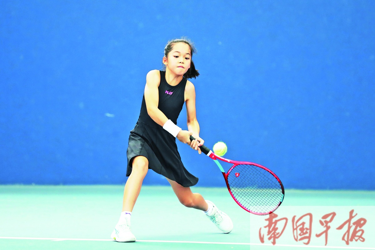 少年球员在比赛中挥拍竞技。记者 覃江宜 摄