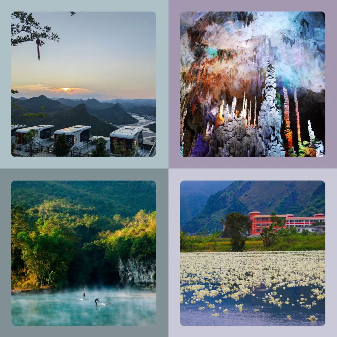 站在山巅与日月星辰对话,潜游河底和水里森林晤谈,和每一棵树握手,和每一株草私语,方知宇宙浩瀚,自然可畏,生命可敬。去会开花的河打卡、去珍珠岩探奇、去怀远古镇走走、去刘三姐故里对山歌......