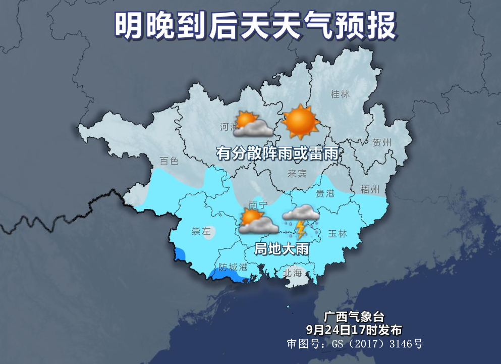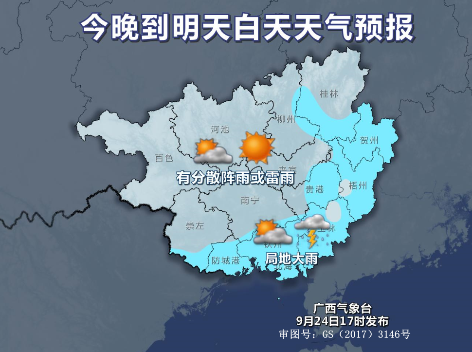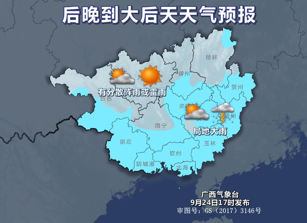 晚上到25日白天,贺州、梧州、玉林、贵港、北海、钦州、防城港等市和柳州南部多云到晴有阵雨或雷雨、局地大雨,我区其它地区多云到晴有分散阵雨或雷雨。