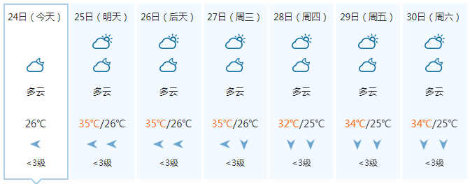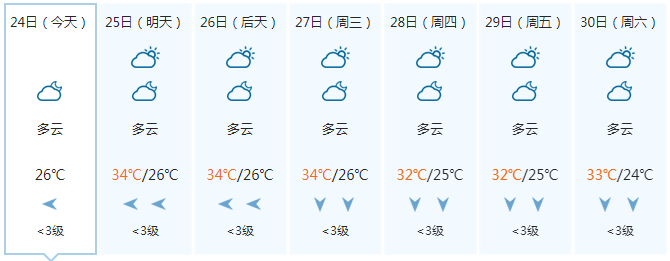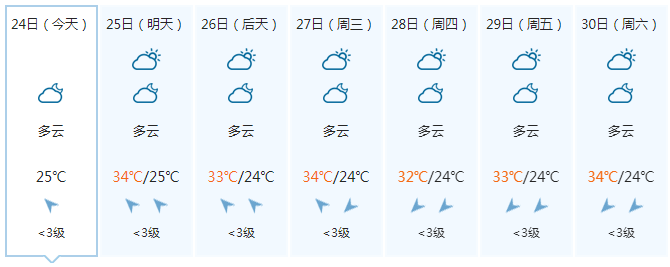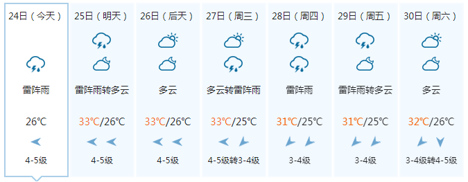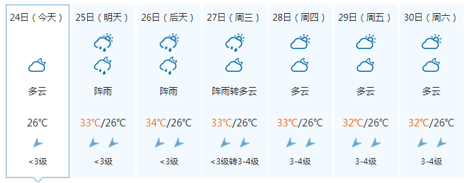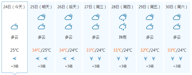 晚上,多云有阵雨或雷雨,偏东风5级、阵风6级;25日白天,多云有阵雨或雷雨、局地大雨,偏东风5~6级、阵风7级;25日晚上到26日白天,中雨、局地大雨到暴雨,偏东风6~7级、阵风8级;26日晚上到27日白天,中雨、局地大雨,偏东风5~6级、阵风7级。