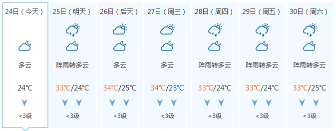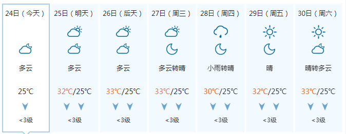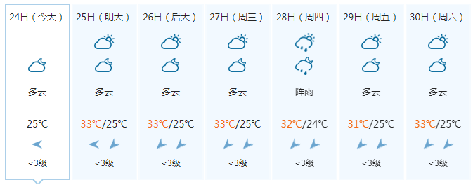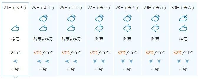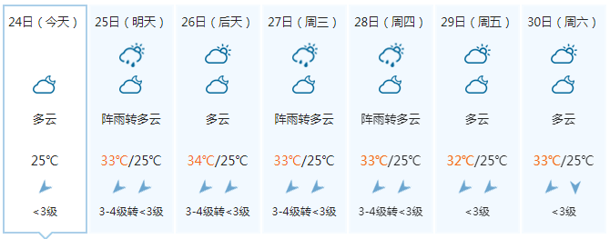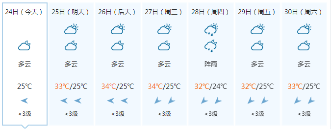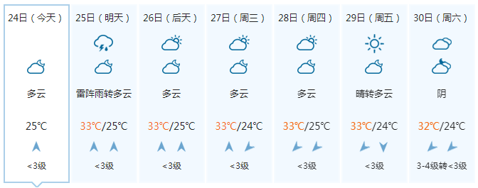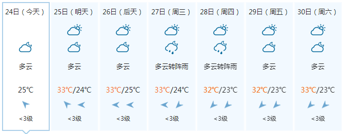晚上多云,25日白天多云、局地有阵雨,偏东风1~2级,最低气温25℃,最高气温33℃。